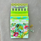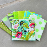Everglow began as a collection of neutrals and evolved into a full collection of radical color designed to add depth to the Tula Pink world of fabrics. When I began designing this collection, I was searching for something new to say about color that would still live in my world. The only realm of color that I have never touched on is the world of neutrals, those subtle colors that create the perfect backdrop to the vibrant color that I am already so fond of. Soft, earthy colors alone wouldn’t stand up to my everyday colors so I decided to pair their whisper with the loudest scream of color I could create on cloth – neons. Each neon is paired with their corresponding neutral in a light, medium and dark. With my neutrals and neons in hand, I just needed a way to illustrate how to use them, so I added 4 large focal prints in two colors each to tie them all together. The animals in Everglow are centered around those that would naturally occur in those palettes. I created golden giraffes in “Neck for Days”, blue grey elephants in “All Ears”, silver hippos in “My Hippos Don’t Lie” and coppery lions in “Good Hair Day”. Each animal is represented in a more accurate color palette and a contrasting color palette that is otherworldly! The result is 8 mini color palette collections that merge together to create an oasis of rainbow goodness in unexpected combinations. - Tula